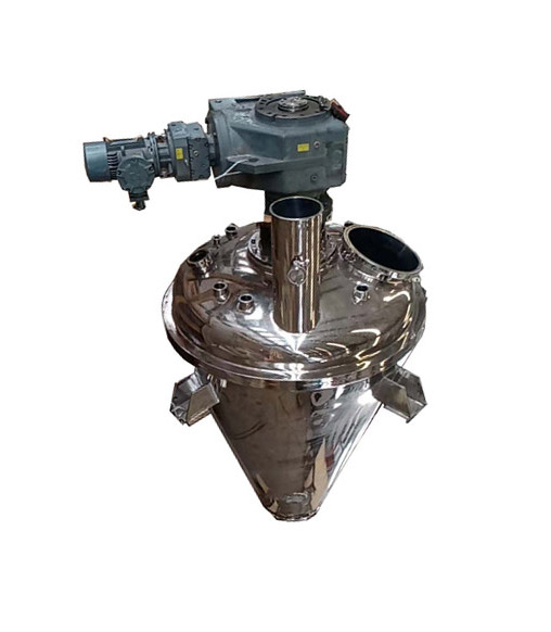 由加熱錐體設有加熱夾套,熱源為熱水、導熱油或低壓蒸汽,從而使錐體內壁保持溫度。變頻調速電機經平行斜齒輪減速機,驅動單螺帶攪拌器旋轉,帶動物料沿錐型筒旋轉并自下而上提升,物料到達至高點后由重力和慣性作用,自動流向旋渦中心回到錐型筒體底部,整個過程使物料在錐型筒體內強制加熱,相對對流、摻混,熱量在物料中相互擴散,使物料不規則往復運動,完成物料同單螺帶和筒壁表面進行高頻率傳熱交換,在短時間內達到加熱干燥的效果。從而使物料內部水份不斷蒸發,在真空泵的作用下,水蒸汽由真空泵引出,如須回收液體可加冷凝器、回收液儲罐回收。干燥完成后,打開下部的出料閥出料。